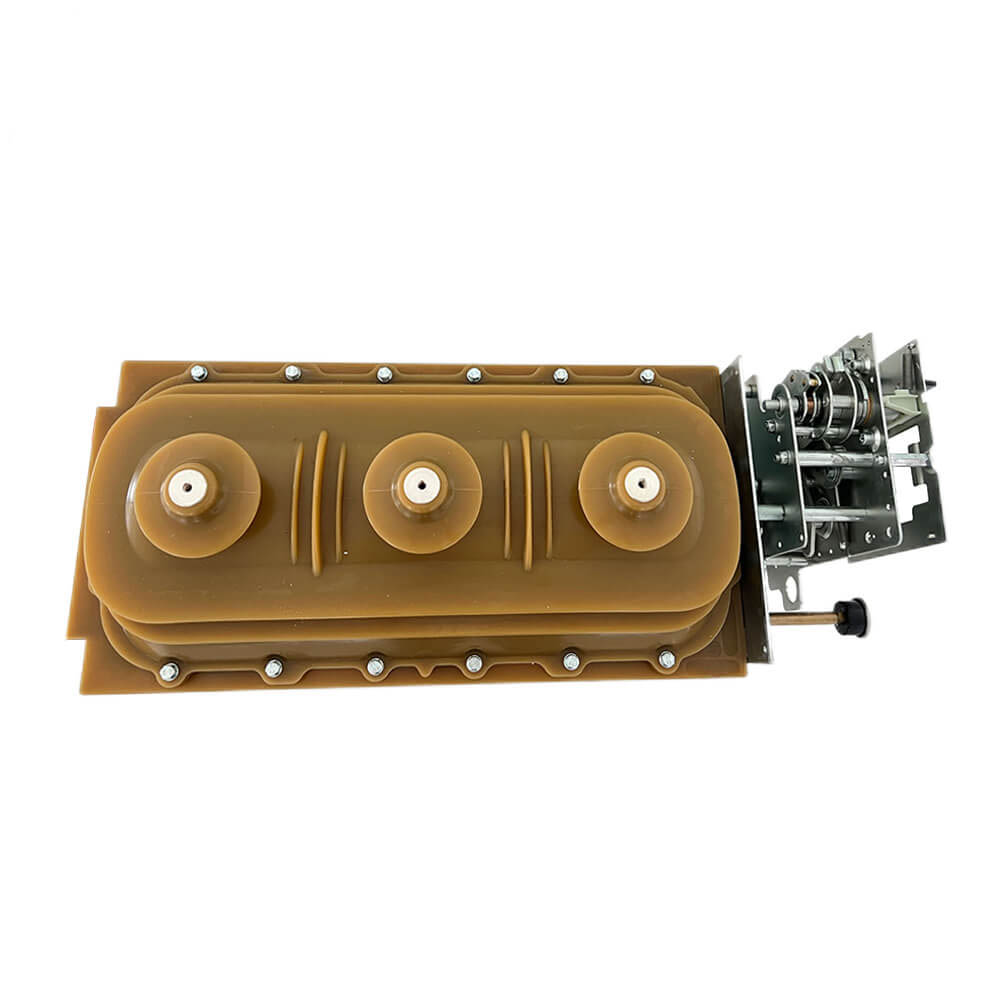 4.Load Breaker Switch asettaa portit, avaus, maadoituskytkin kolme yhdellä, täytetty SF6-kaasulla, joka on kapseloitu epoksihartsikoteloon, kolmen aseman lukitus, kompakti rakenne, korkea turvallisuus ja luotettavuus.