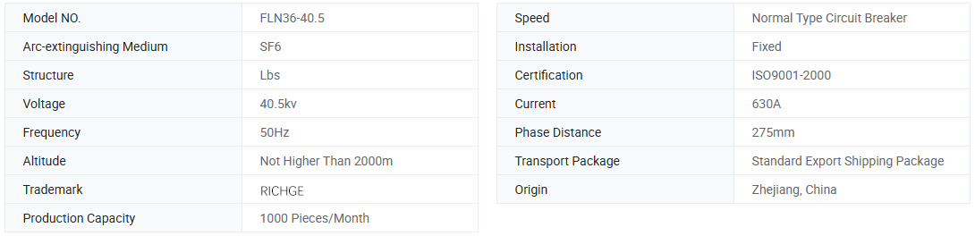 FLN36-40.5D/T630 Sisätilojen rikki heksafluoridi (SF6) kuormituskytkin ja FLN36-40.5DR/125 -kuormakytkimen sulakeyhdistelmä ovat sopivia voimalaitoksille ja teollisuuslaitteille, joissa on kolmivaiheinen AC 50/60Hz Rengasverkko tai terminaalivirtalähde. Niitä käytetään kuormanhallintalinjan suojauksena sähköjärjestelmille. Kuormituskytkin jakaa ja sulkee kuormitusvirran, suljetun silmukan virran, kuormituksen muuntajan ja kaapeliluettelon virran; Yhdistelmä sähkölaitteet voivat rikkoa minkä tahansa virran nimellisnustettujen oikosulkuvirran alla ja soveltuvat sähköisten laitteiden, kuten renkaan pääyksiköiden ja laatikkotyyppisten aineiden, joissa on sähköinen kokonaisjoukko.
