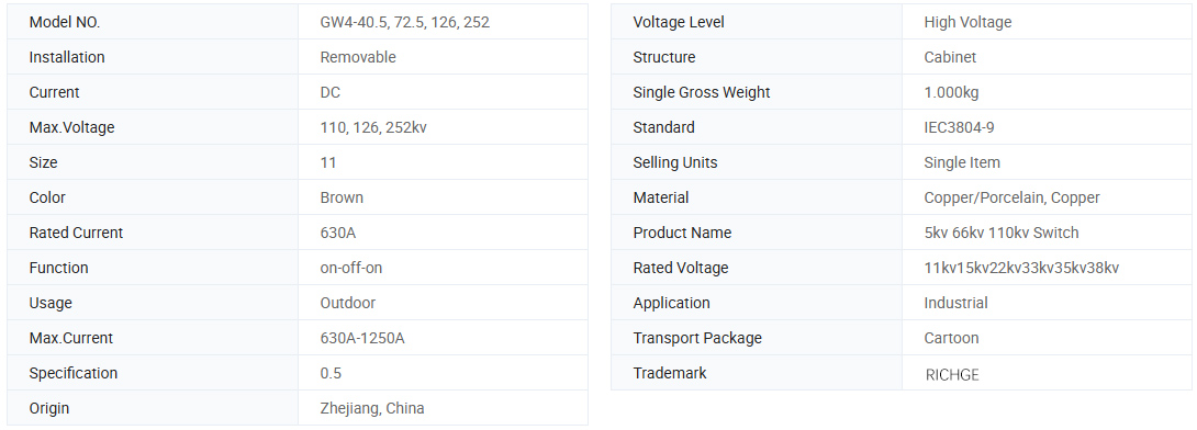 GW4-12(40.5)ulkokäyttöinen AC suurjännitekatkaisija on tarkoitettu avaamaan ja sulkemaan piirin jännitteellä, mutta kuormittamattomalla 50/60Hz, 12(40.5)kV tehojärjestelmällä. Se on standardien IEC129-1984 AC katkaisin ja maadoituskytkin sekä GB1985 ja muiden vastaavien standardien mukainen.
