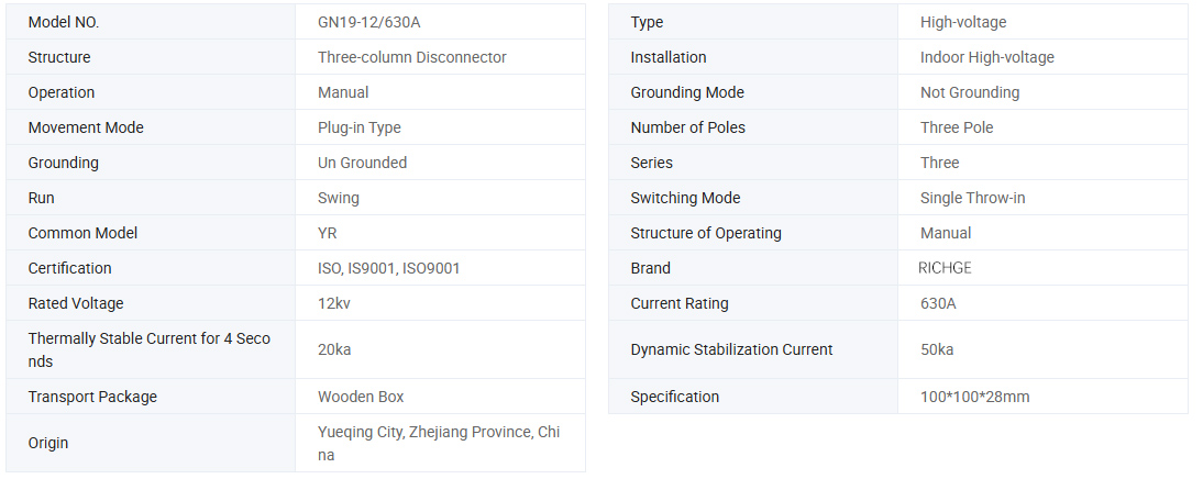 GN19-12(c)-sarjan sisätilojen AC korkeajännitteinen eristyskytkin sopii AC 50hz, nimelliskäyttöjännite 12kv, 10kv, nimelliskäyttövirta 400A, 630A, 1250A sähköjärjestelmään, jännitteenä ja kuormittamattomana käsikäyttöisenä katkaisutilanteessa, suljetun järjestelmän 2 sisäjännitekytkimellä. mekanismi, jota käytetään sähkölaitteiden kytkemiseen jännitteen ollessa, mutta ilman kuormitusta. Toimitetaan myös tuottamaan kiinnittymisenesto-, tasanne- ja live-näyttölaitteita, jotka voidaan asentaa. GN19-12-sarjan sisätilojen korkeajännitekatkaisin on sisäkäyttöinen laite, jonka nimellisjännite on 12kv ja kolmivaiheinen vaihtovirta 50hz.