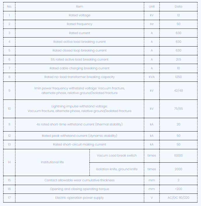 Tällä tuotteella on kompakti rakenne, pieni tilavuus, pitkä käyttöikä, vahva sulkeminen ja katkaisukyky sekä helppo käyttö ja ylläpito. Tyhjiökytkin on varustettu jousen toimitetulla mekanismilla, joka ottaa käyttöön sähkömoottorin (toinen manuaalinen) jousenergian varastointi, ja sulkemismenetelmiä on kahta tyyppiä: sähkömagneetin sulkeminen ja manuaalinen jakaminen ja sulkeminen. Irrotuskytkin, tyhjiökytkin ja maadoituskytkin on lukittu toisiinsa (mekaaninen lukitus) väärinkäytön estämiseksi.