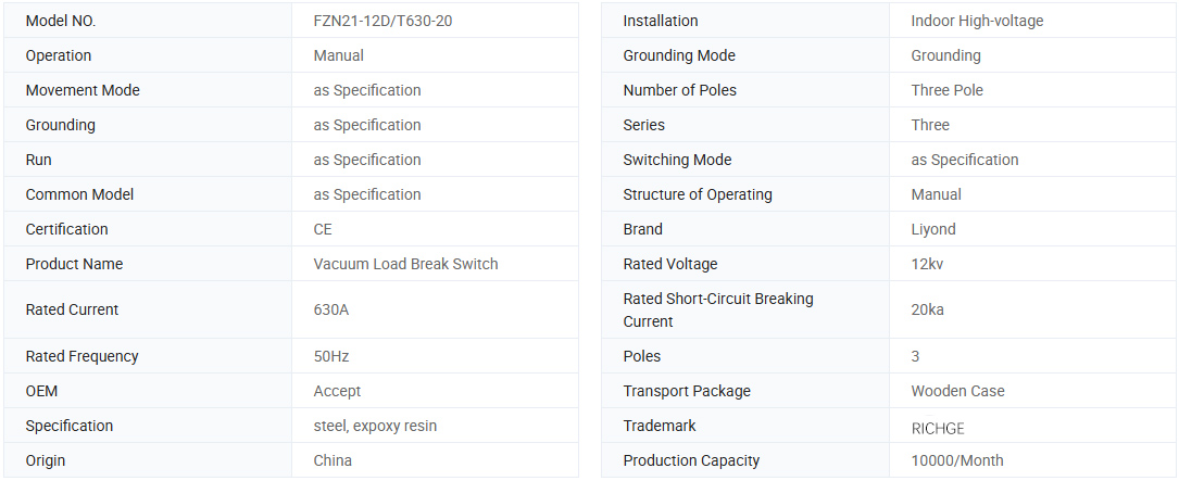 FZN21-12D/T630-20 Sisätilojen korkeajännitteen tyhjiökuormakatkokytkin, joka sopii voimansiirtoverkkoon, jonka nimellisjännite on 10 kV kolmivaiheinen AC 50Hz, jota käytetään kuormitusvirran rikkomiseen.