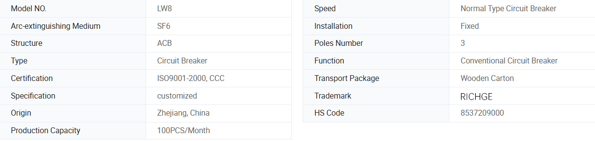 LW8-40.5, LW8A-40.5 -sarja-rikkiheksafluoridivirtakatkaisijat ovat kolmivaiheista AC 50Hz: n ulkoilua korkeajännitettä, joka soveltuu 40,5 kV: n siirto- ja jakelujärjestelmän ohjaamiseen ja suojaamiseen, voidaan käyttää myös yhteysvirtakatkaisijoille sekä avoimille ja läheisille kondensaattoripankkille. Tuotetta voidaan käyttää CT14 -jousimekanismin kanssa. Katkaisija vastaa kansallista standardia GB1984-1989 AC: n korkeajännitevirtakatkaisijaa ja kansainvälistä electroteknisen komission standardia IEC56, IEC6220-100 korkeajännite AC-katkaisija.