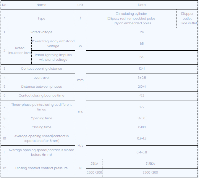 VBI-24-sivulle asennetun tyyppisen tyhjiöpiiri-dekantterilasterin toimintamekanismia käytetään jousen energiaan, jota voidaan käyttää kahdella tavalla, manuaalisesti tai sähköisesti. Ominaisuudet ovat GB1984-89: n, JB3855-96: n mukaisia, JB3855-96<10kv Indoor High Voltage Vacuum Circuit Breaker General Technical Specifications>, IEC56 -standardin asiaankuuluvat säännökset.