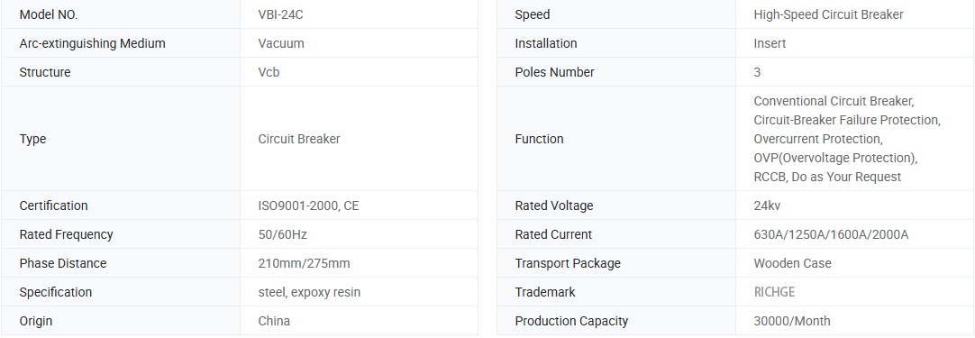 VBI-24 VCB asennetaan yleensä kytkentäpaneeliin KYN28 ja XGN. Sitä voidaan soveltaa toisinaan, jolla on usein toimenpide, sillä on nopea uusinta, useita aukko/sulkeminen, luotettava mekaaninen lukitus. Siinä on kiinteä tyyppi ja vetäytymistyyppi. Se hyväksyy komposiittieristetyn materiaalin, pilaantumista ja räjähdysvaaraa ei ole, eristysaste on korkea.