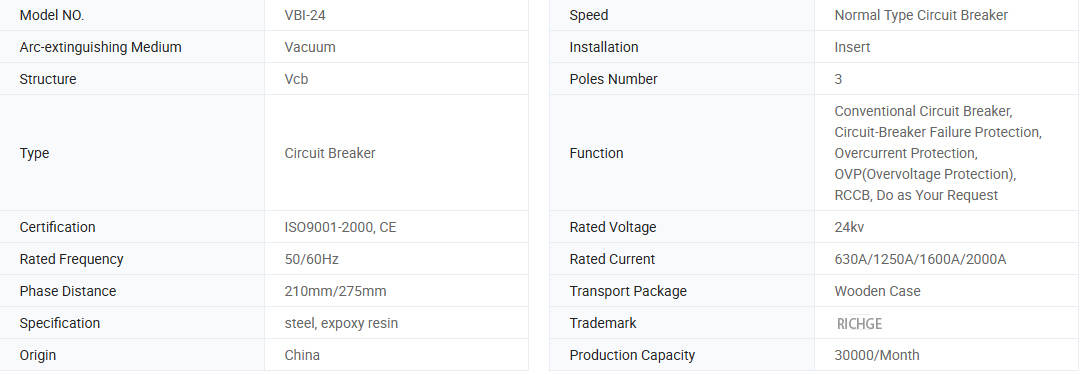 VBI-24-sivulle asennetun tyyppisen tyhjiöpiiri-dekantterilasterin toimintamekanismia käytetään jousen energiaan, jota voidaan käyttää kahdella tavalla, manuaalisesti tai sähköisesti. Ominaisuudet ovat GB1984-89: n, JB3855-96: n mukaisia, JB3855-96<10kv Indoor High Voltage Vacuum Circuit Breaker General Technical Specifications>, IEC56 -standardin asiaankuuluvat säännökset.