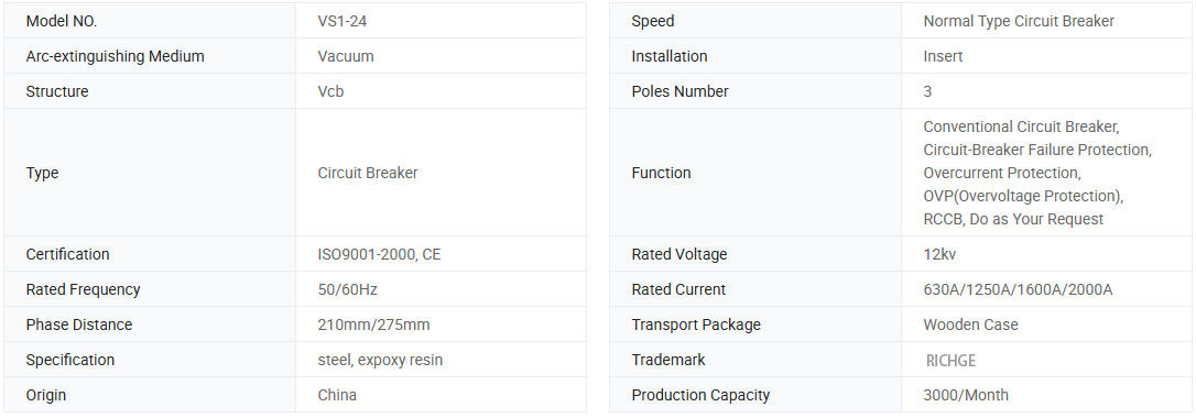 VS1-24 sisätilojen korkeajännitteen tyhjiökatkaisija, jolla on yhteinen eristetty sylinteri, on kolmifraasi A.C. 50 Hz: n sisätehon jakeluvälineet, joiden nimellisjännite on 24 kV. Sitä käytetään suojaamaan sähkölaitteita teollisuuden ja kaivosyrityksen, voimalaitosten ja sähköaseman aloissa. Tämä tyyppinen tyhjiökatkaisija on kansallisten standardien mukainen ja IEC-standardin määräys, kyky saavuttaa M2-E2-C2-luokan.