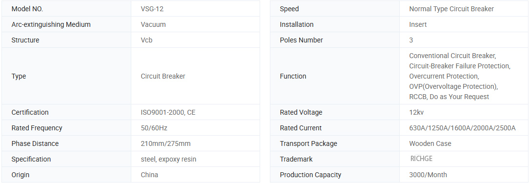 VSG-12-tyyppinen sisätilojen korkeajännite tyhjiökatkaisija käytetty jousen energiaan. Käyttömekanismia voidaan käyttää kahdella tavalla manuaalisen ja sähkömotive-toiminnan avulla ominaisuudet ovat GB1984-2003 korkeajännite AC-katkaisija, JB3855-1996 3,6-4,5KV Indoor AC AC High jännite AC Cirgracer ja IEC-standardi 62271-100: 200162271-100: 2001 High Voltage AC AC Circuiter -katkaisinta