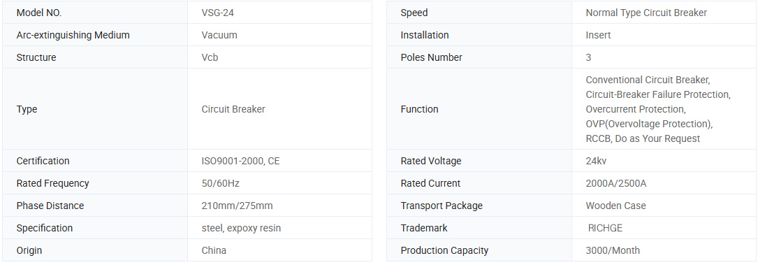 VSG-24-sarjan sisätilojen korkeajännitteen tyhjiökatkaisija, jossa on sulautettuja pylväitä, on kolmivaiheinen A.C 50Hz Sisätehon jakelulaitteita, joiden nimellisjännite on 24 kV. Sitä käytetään sähkölaitteiden suojaamiseen ja hallintaan teollisuus- ja yritystoiminnan, voimalaitosten ja sähköaseman aloilla. Tämän tyyppisen tyhjiön katkaisijan tärkein johtava piiri käyttää sulautettua napaa, joka on sovitettu modulaariseen organisaatioon ja integroidun energian varastointikahvan kanssa. Kokonaisasettelu on kohtuullinen, täydellisesti lyhyyden kanssa ja todella toteuttaa vapaan ylläpidon ja pidemmän mekaanisen ja sähköisen elämän.